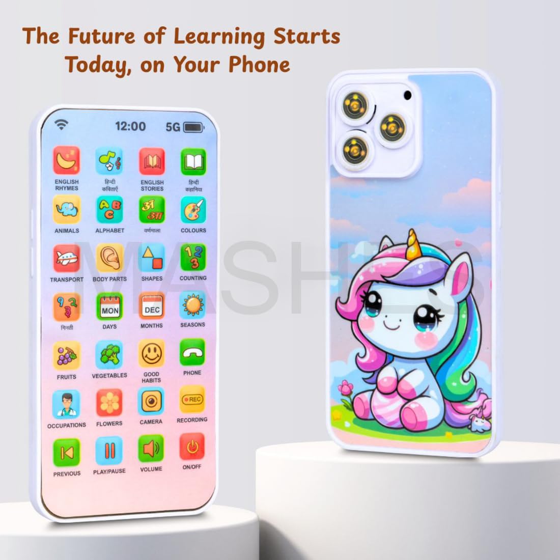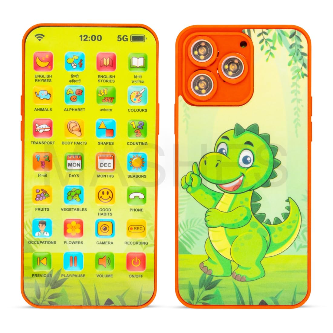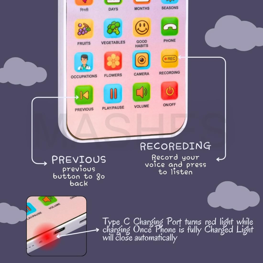 ഞങ്ങളുടെ നൂതനമായ വിദ്യാഭ്യാസ കളിപ്പാട്ട ഫോൺ ഉപയോഗിച്ച് പഠനത്തിന്റെ ഒരു ലോകം കണ്ടെത്തൂ! ഒന്നിലധികം വിഷയങ്ങൾ പഠിപ്പിക്കുന്നതിനാണ് ഈ സംവേദനാത്മക ഉപകരണം രൂപകൽപ്പന ചെയ്തിരിക്കുന്നത്, ഇത് ജിജ്ഞാസയുള്ള യുവ മനസ്സുകൾക്ക് അനുയോജ്യമായ ഒരു കൂട്ടാളിയാക്കുന്നു. ഇംഗ്ലീഷ്, ഹിന്ദി അക്ഷരമാലകൾ മുതൽ അക്കങ്ങൾ, ആകൃതികൾ തുടങ്ങി നിരവധി വിഷയങ്ങൾ കുട്ടികൾക്ക് വിരൽത്തുമ്പിൽ പര്യവേക്ഷണം ചെയ്യാൻ കഴിയും. കുട്ടികൾക്ക് സ്വന്തം ശബ്ദങ്ങൾ പകർത്താനും പ്ലേബാക്ക് ചെയ്യാനും അവരുടെ സംസാരശേഷി വർദ്ധിപ്പിക്കാനും ആത്മവിശ്വാസം വർദ്ധിപ്പിക്കാനും അനുവദിക്കുന്ന ഒരു ആവേശകരമായ വോയ്സ് റെക്കോർഡ് ഫംഗ്ഷനും ഈ കളിപ്പാട്ടത്തിൽ ഉണ്ട്. ഉപയോക്തൃ-സൗഹൃദ രൂപകൽപ്പനയും ആകർഷകമായ ഉള്ളടക്കവും ഉപയോഗിച്ച്, ഈ വിദ്യാഭ്യാസ കളിപ്പാട്ട ഫോൺ വിവിധ വിഷയങ്ങളിലുടനീളം വിനോദത്തിനും പഠനത്തിനും അനന്തമായ അവസരങ്ങൾ വാഗ്ദാനം ചെയ്യുന്നു.